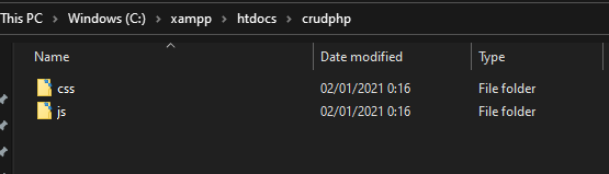 3. Agar terbiasa rapi, buat folder assets didalam folder crudphp tadi dan letakkan folder css & js bootstrap ke dalam folder assets seperti ini :